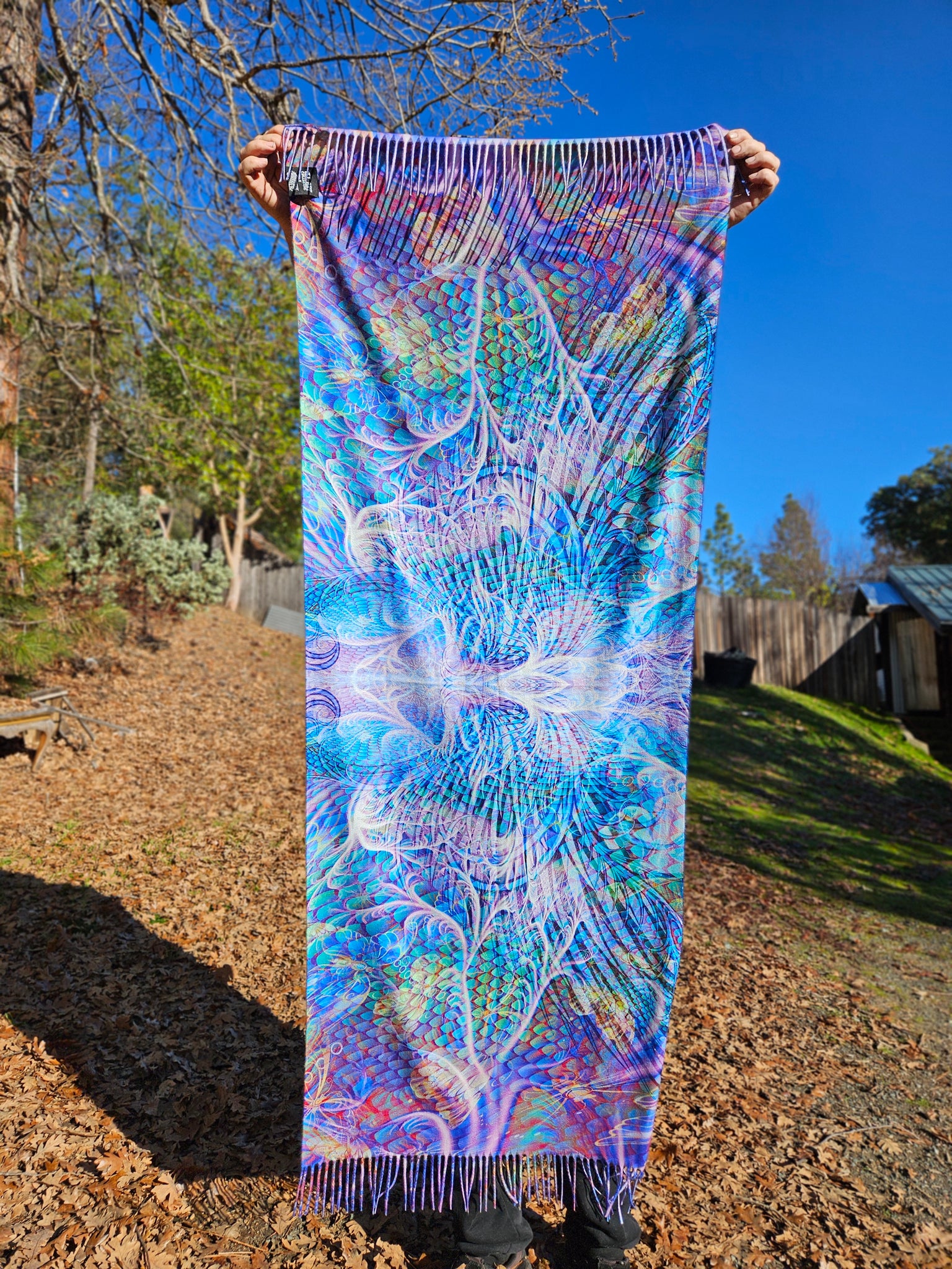 The high-quality sublimated printing ensures the vibrant, intricate details remain vivid, wear after wear. This pashmina is perfect for those who want to make a bold statement, whether at festivals, outdoor adventures, or as part of a distinctive everyday look.